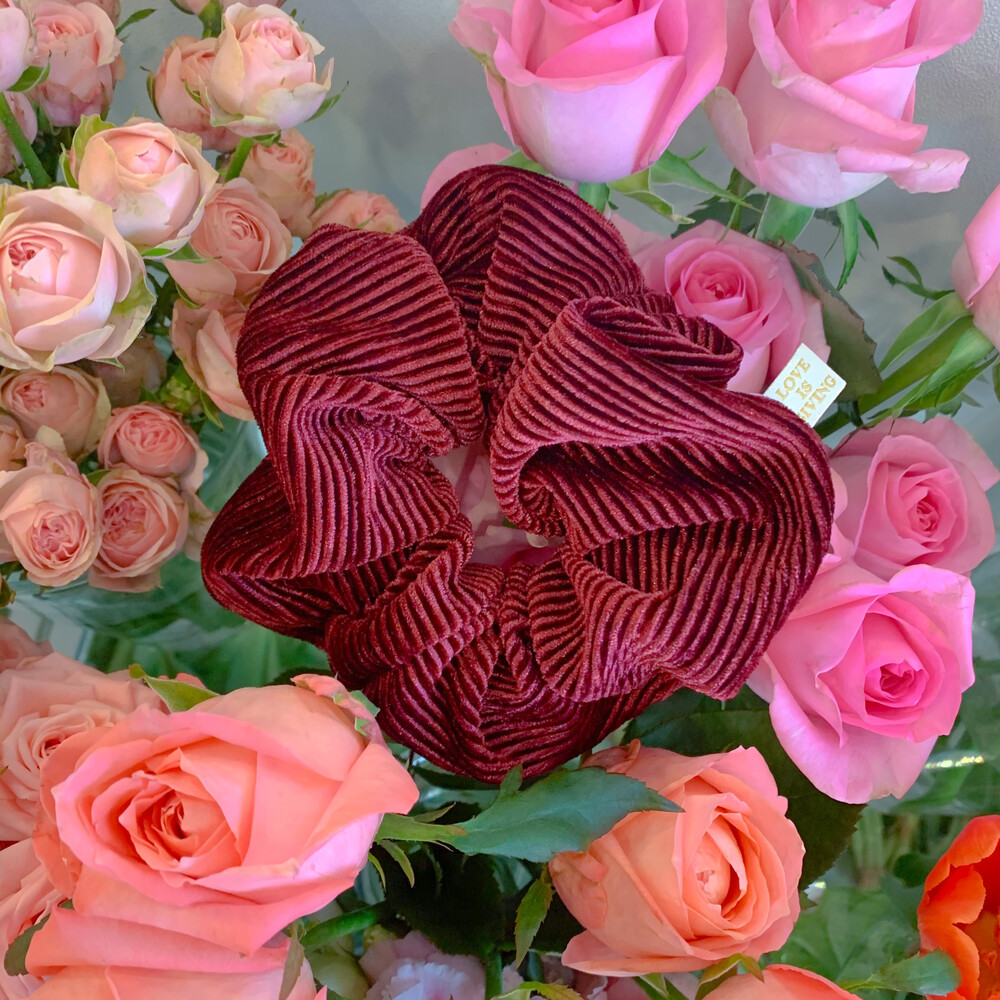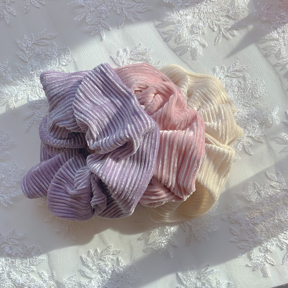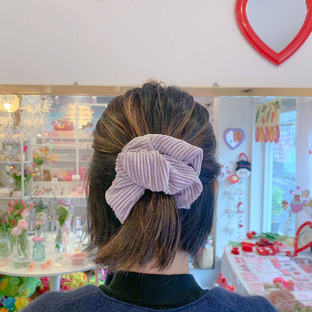 캐쥬얼한 코듀로이 느낌에 반짝이는 소재의 패브릭으로 제작한 슈슈에요.