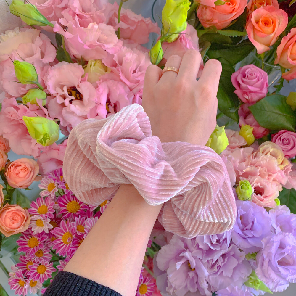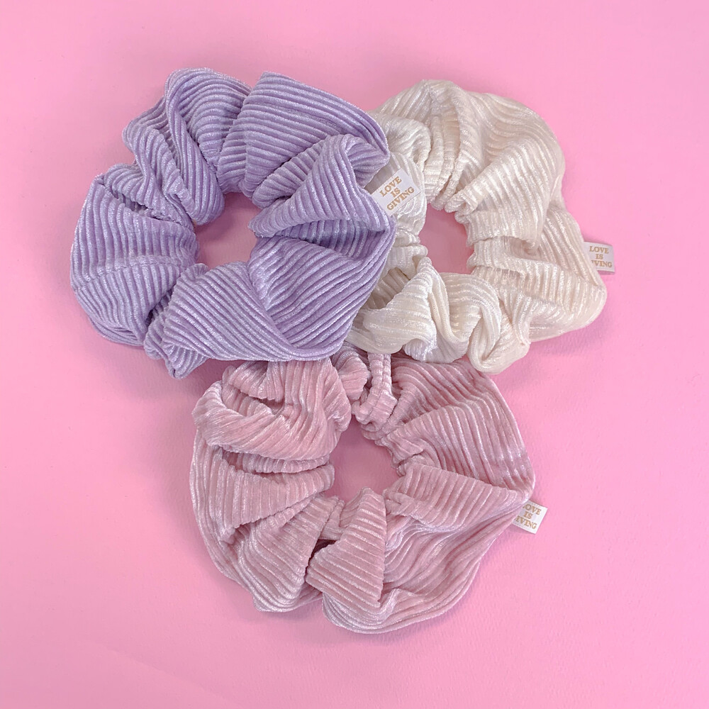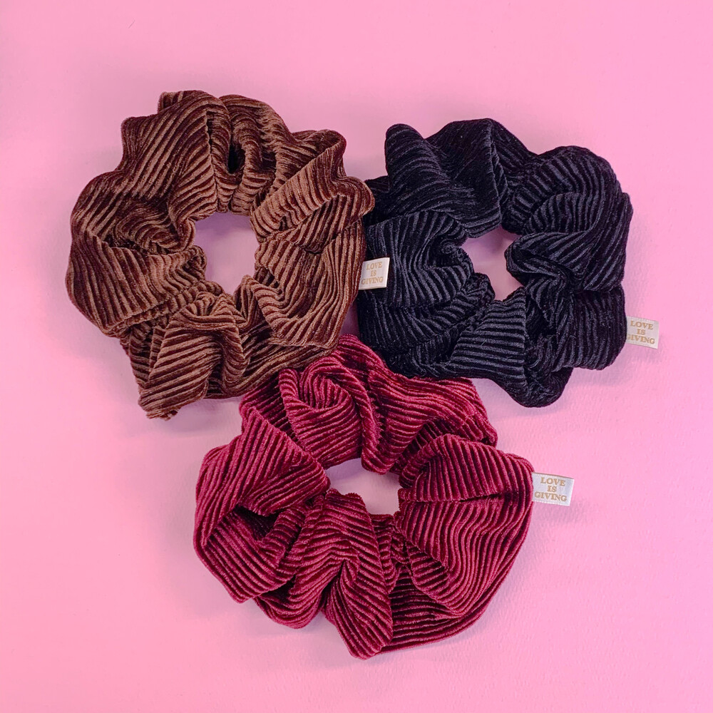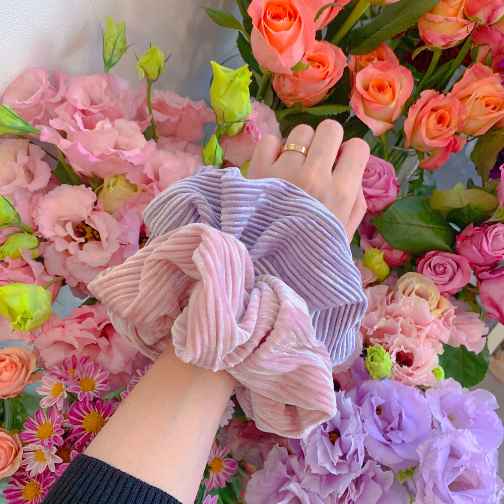 캐쥬얼한 코듀로이 느낌에 반짝이는 소재의 패브릭으로 제작한 슈슈에요.